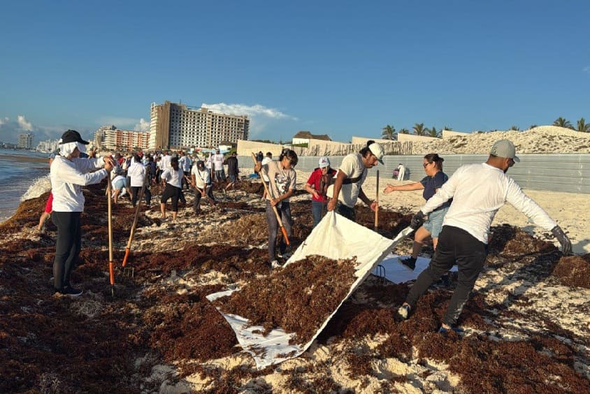 CANCUN, QR – Más de 500 personas se alinearon en playas de Cancún para la eliminación masiva de Sargassum acumulado el sábado. Los vientos de fin de semana asociados con la actividad de tormentas eléctricas empujaron las algas a las costas de la ciudad el día anterior.