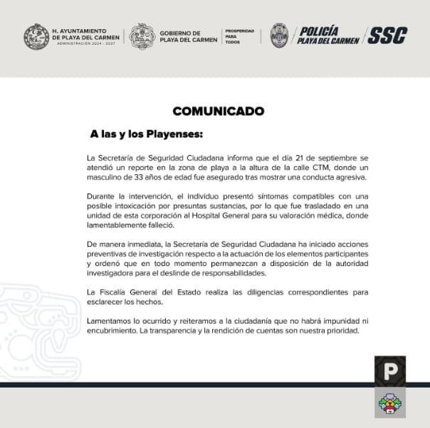 PLAYA DE CARMEN, QR – Las autoridades están investigando la muerte de un hombre arrestado por la policía de Playa del Carmen. Según la secretaría de Seguridad Ciudadana (SSC), el jugador de 33 años fue detenido el domingo por la tarde desde su bote.