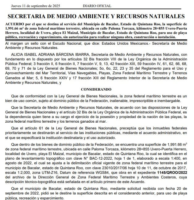 Las áreas de playa fueron otorgadas al municipio de Bacalar solo para uso de recreación pública. La entrega de los derechos de la superficie no significa ninguna autorización para ningún proyecto, construcción o instalación, según el acuerdo publicado en la Gaceta Oficial de la Federación.