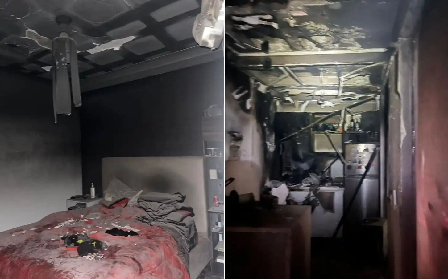 Al menos dos grandes zonas del apartamento quedaron completamente destruidas por el incendio de la tarde. Un dormitorio quedó destruido por el calor, el humo y el agua, mientras que el área de servicios de la cocina quedó en ruinas debido a las llamas.