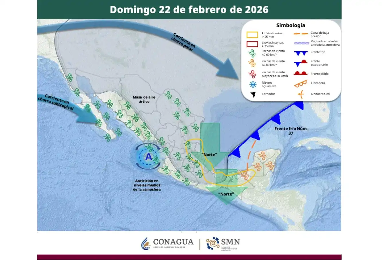Se mantendrán los vientos fuertes del norte con rachas de 80 a 100 km/h en el Istmo y Golfo de Tehuantepec, rachas de viento de 60 a 80 km/h en Veracruz y rachas de 50 a 70 km/h en Tabasco, Campeche, Yucatán y Quintana Roo.
