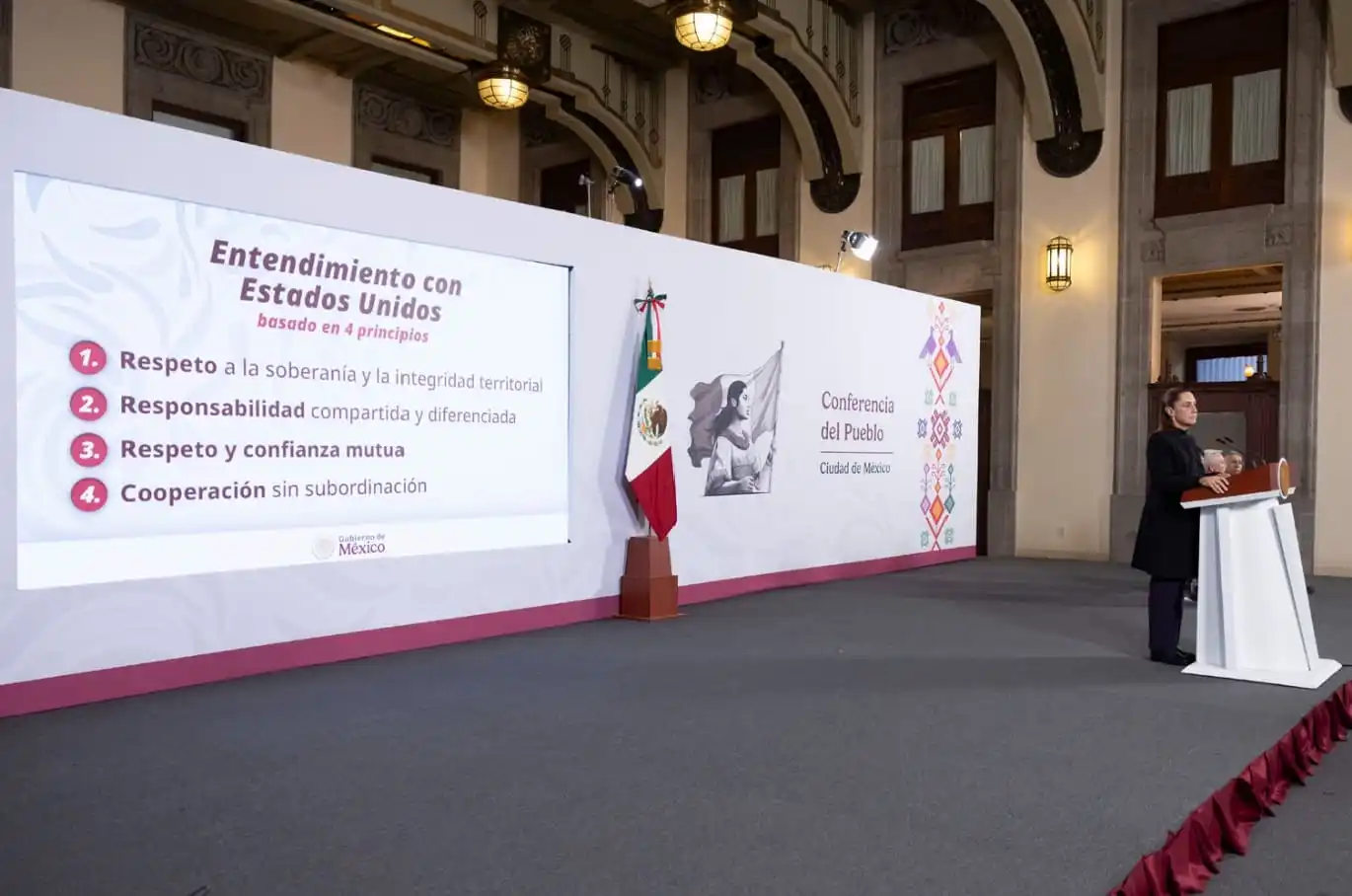 El Presidente Sheinbaum dijo que el entendimiento entre México y Estados Unidos ha sido respetado y ambas naciones se coordinan con base en los principios de soberanía e integridad territorial, responsabilidad compartida, respeto y confianza mutuos, así como la cooperación sin subordinación.