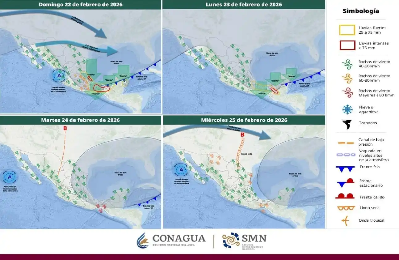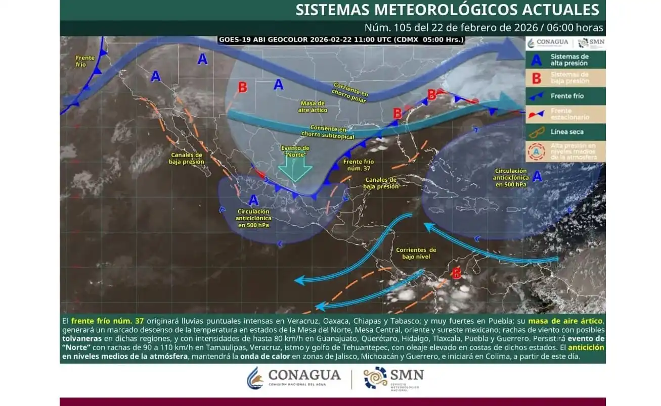 El Servicio Meteorológico Nacional dice que continúan monitoreando los efectos del frente frío No. 37 en el noreste, oriente, centro y sureste de México.