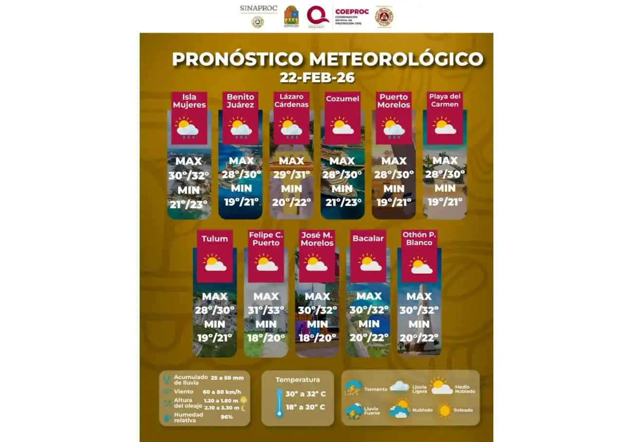 Para el domingo por la noche, Protección Civil Estatal (Coordinación Estatal de Protección Civil Quintana Roo) dice que las temperaturas locales se mantendrán normales para esta época del año con máximas promedio diurnas de 32C (89F) y mínimas nocturnas de 19C (66F).