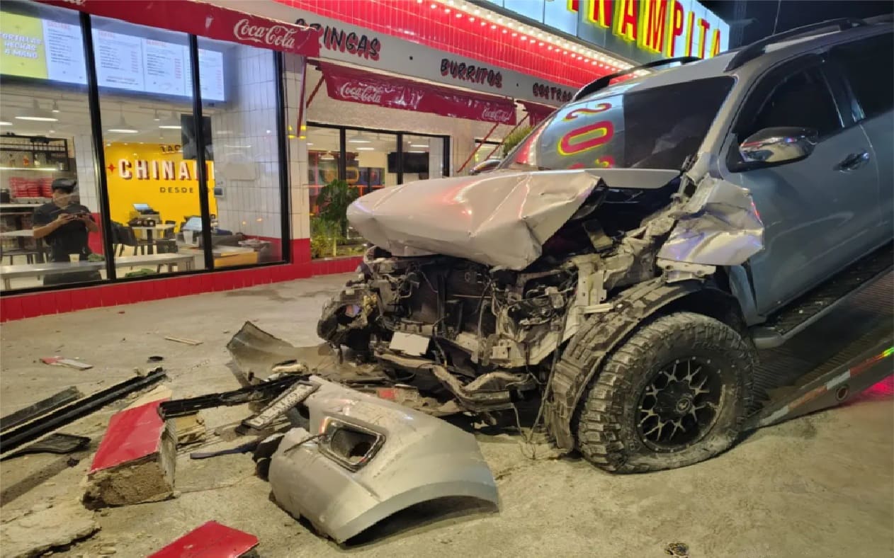 Cancún, QR — El conductor de una camioneta destrozó su vehículo después de estrellarse contra el frente de un restaurante. La policía estuvo en el lugar del accidente en SM 31 el jueves después de los informes del percance de un solo vehículo.