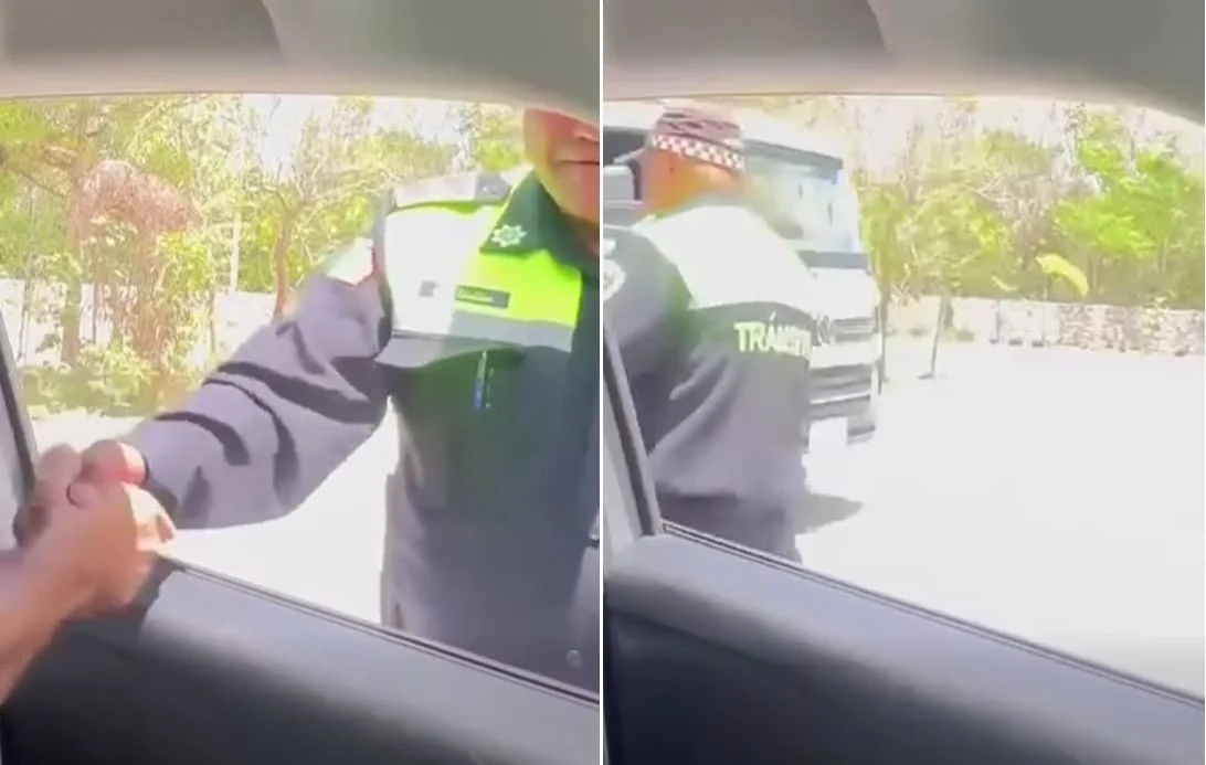 Este último video muestra a un oficial de Tránsito de Tulum deteniendo a un conductor a plena luz del día y tomando dinero a cambio de que no lo arresten, ni lo remolquen ni lo multen.