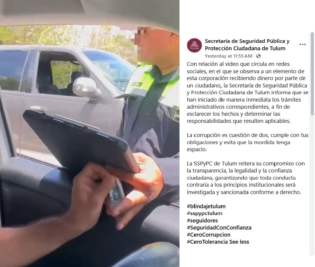 “Sobre el video que circula en redes sociales, en el que se ve a un miembro de esta dependencia recibiendo dinero de un ciudadano, la Secretaría de Seguridad Pública y Protección Ciudadana de Tulum informa que de inmediato se han iniciado los procedimientos administrativos correspondientes para esclarecer los hechos y determinar las responsabilidades que correspondan”, dijeron ayer.