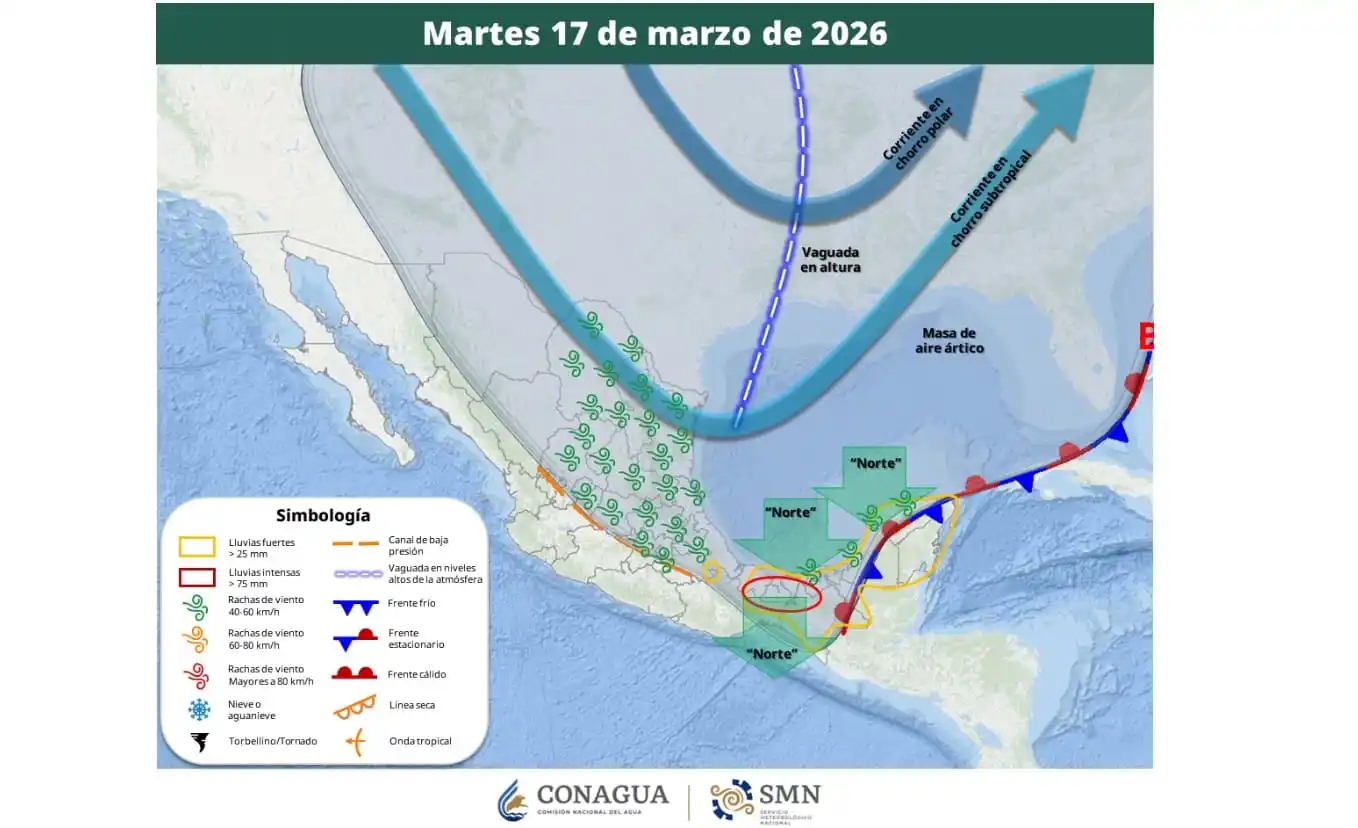 “El sábado y domingo, una vaguada en altura se desplazará sobre el Golfo de México y la Península de Yucatán. Interactuando con un sistema de baja presión sobre la península y el sureste de México, producirá chubascos y fuertes lluvias en estas regiones.