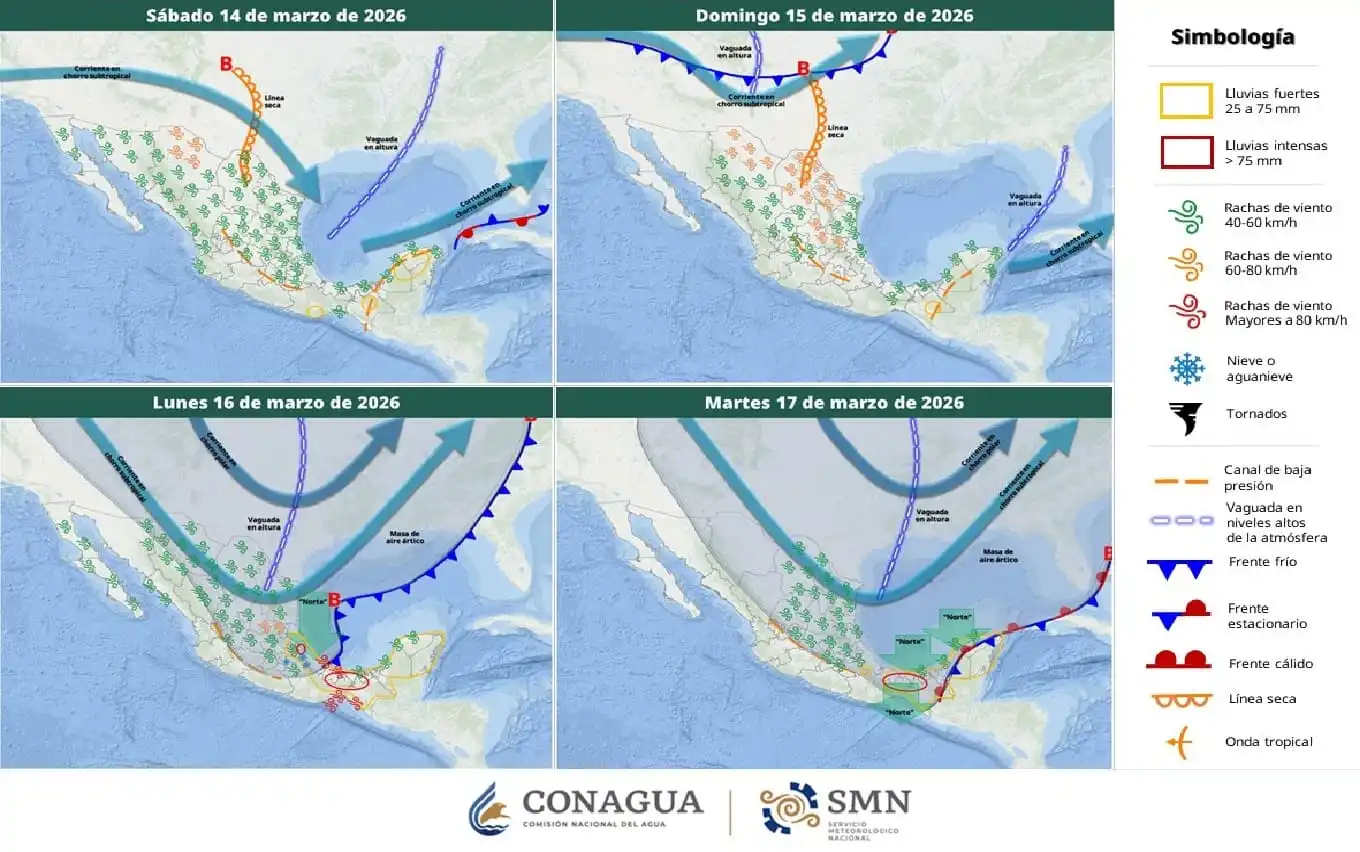 “Durante el período de pronóstico, canales de bajas presiones sobre el interior del país, sumado a la inestabilidad atmosférica y el ingreso de humedad desde el Océano Pacífico, Golfo de México y Mar Caribe provocarán aguaceros y tormentas dispersas en estados del noreste, occidente, centro y sur del país.