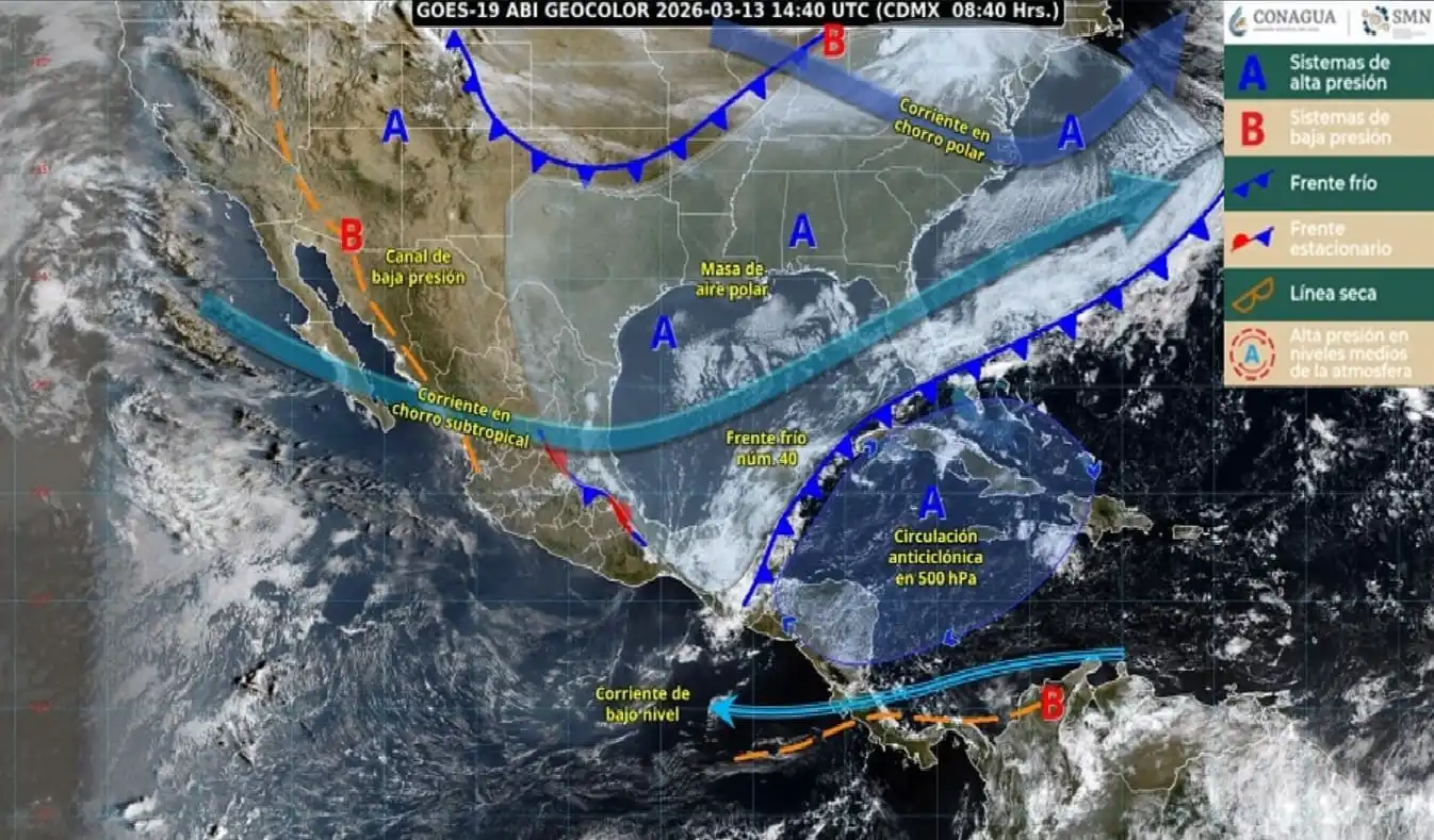 “La noche del domingo un nuevo frente frío (N° 41) ingresará al norte y noreste de México interactuando con una vaguada en los niveles medio y superior de la atmósfera y con las corrientes en chorro polares y subtropicales generando fuertes rachas de viento en las regiones mencionadas, así como lluvias y chubascos en Tamaulipas.