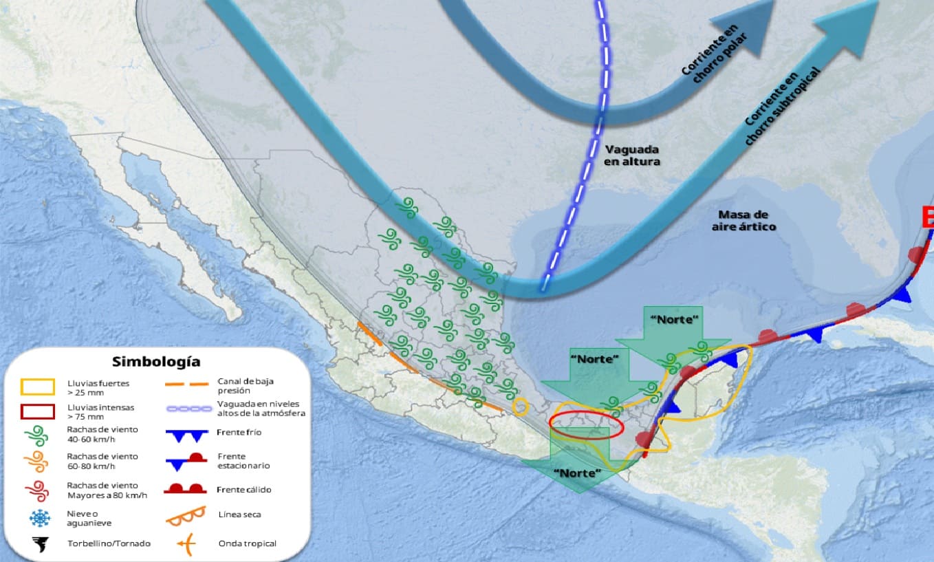 La llegada del frente frío 41 también incluirá “un intenso evento Norte con rachas de 100 a 120 km/h en Tamaulipas y Veracruz, con rachas de 80 a 100 km/h en el Istmo y Golfo de Tehuantepec (Oaxaca y Chiapas)”, según el Servicio Meteorológico Nacional (SMN).