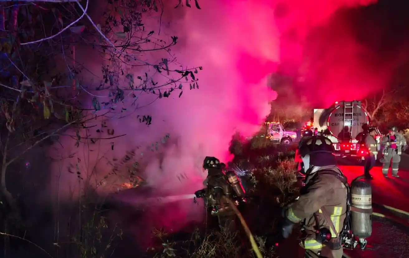 Cancún, QR — Los bomberos de Cancún se encontraban en el lugar de un accidente de dos vehículos que dejó en llamas la maleza de la carretera. El incendio se inició luego de que dos vehículos chocaran, provocando que uno de ellos estallara en llamas.