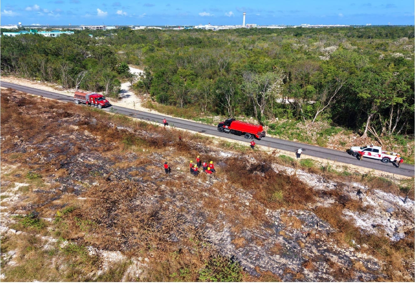 “Atención a incendio de vegetación en vía. Elementos del Cuerpo de Bomberos de Cancún en coordinación con Protección Civil de Cancún trabajaron para extinguir un incendio de vegetación al costado de la carretera Cancún – Mérida”, informó Bomberos Cancún.