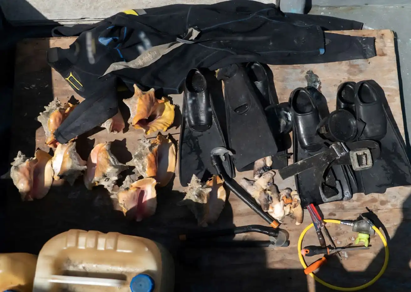 “Tras la inspección, se encontraron equipos de pesca prohibidos, incluidos trajes de buceo, aletas, snorkels, máscaras, anzuelos y herramientas de perforación, destornilladores y un compresor.