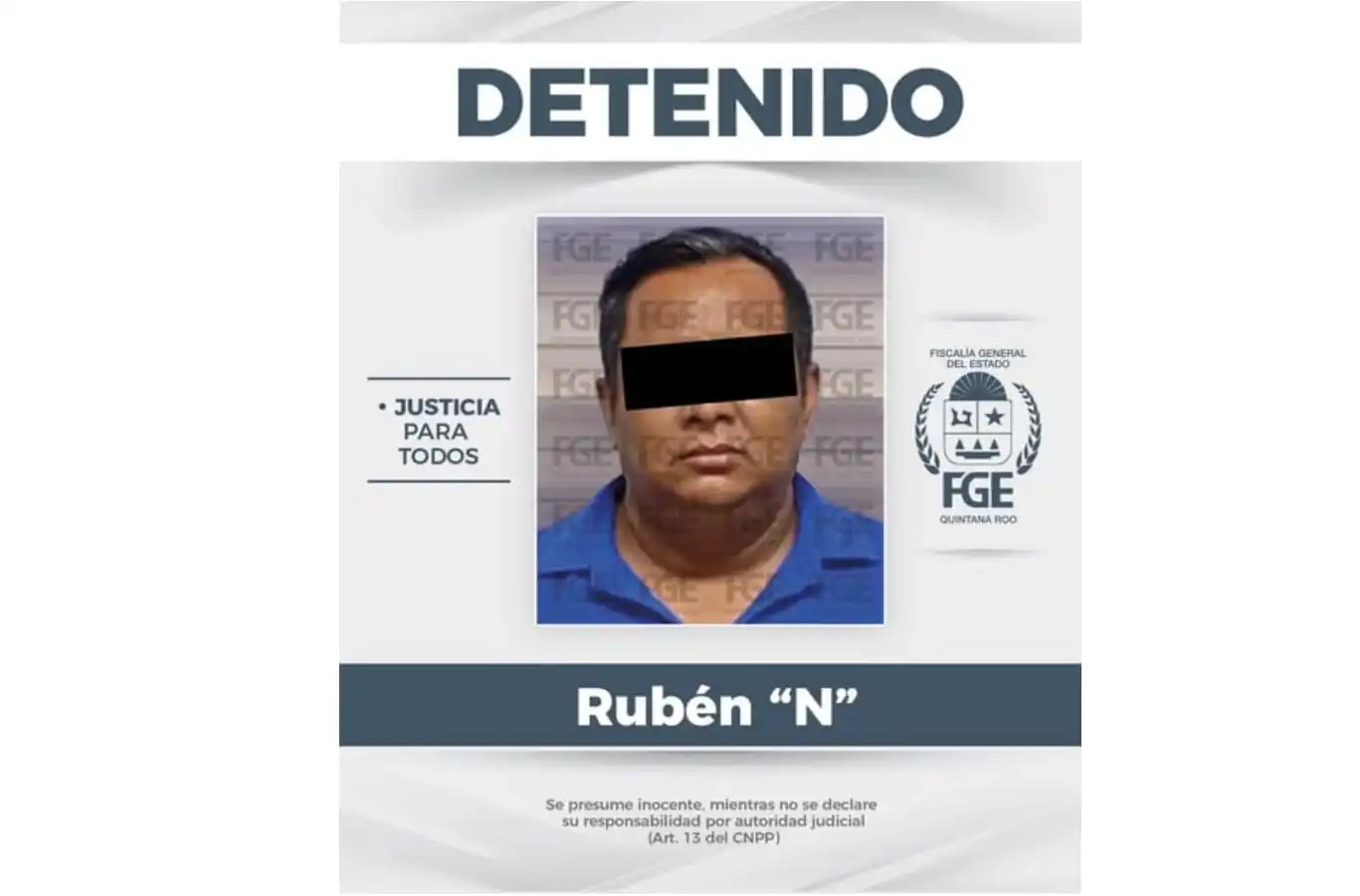 “La Fiscalía General del Estado de Quintana Roo (FGE Quintana Roo) informa la detención de un individuo del sexo masculino, identificado como Rubén “N”, docente de secundaria, por su presunta participación en hechos que podrían constituir el delito de corrupción infantil en el municipio de Playa del Carmen.