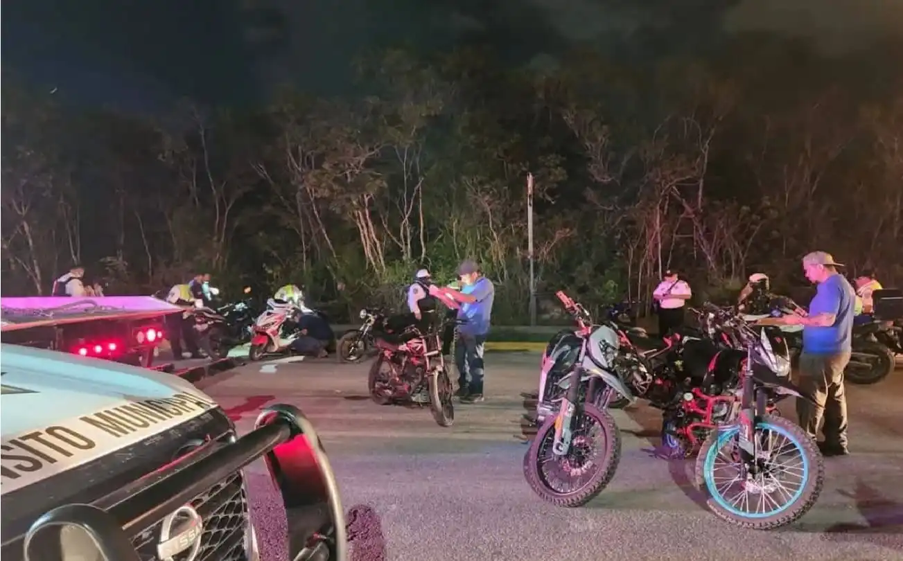 El domingo por la noche en la SM 215 de Cancún, la policía llegó con grúas antes de una concentración de motociclistas planificada. En el operativo participaron decenas de agentes que detuvieron a los conductores para comprobar sus trámites legales.