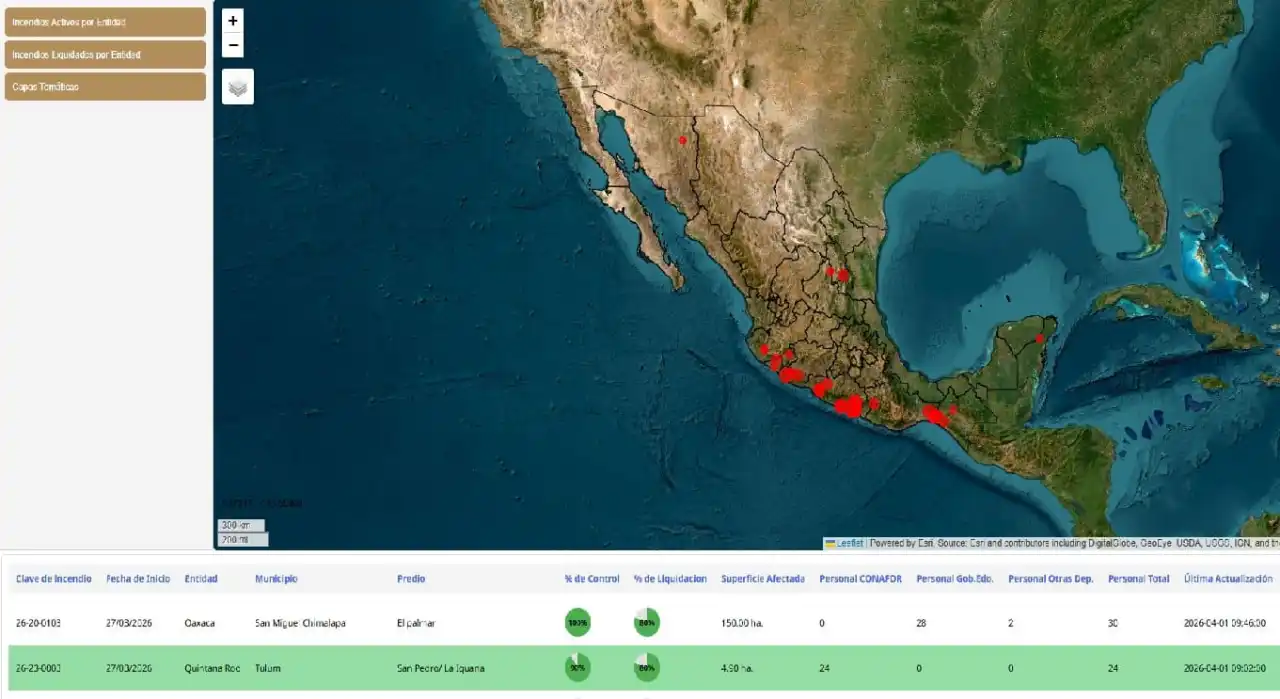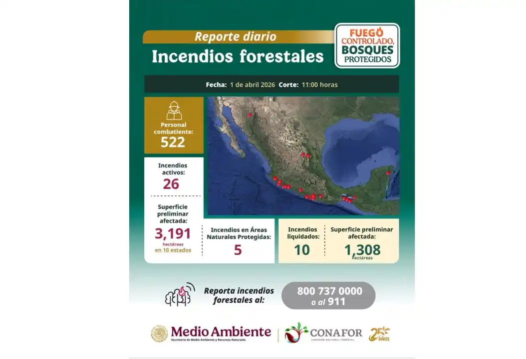 Según la Conafor, al 1 de abril hay 26 incendios forestales activos en todo México. Más de 500 bomberos están combatiendo las llamas en cinco estados que hasta ahora han afectado a más de 3.000 hectáreas.