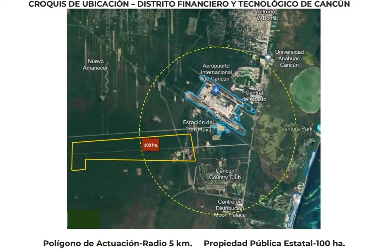 La gobernadora María Lezama dice que las 100 hectáreas son terrenos de propiedad estatal ubicados aproximadamente a cinco kilómetros del aeropuerto. El Distrito Financiero y Tecnológico es un proyecto que atraerá más crecimiento y desarrollo a Quintana Roo, afirmó.