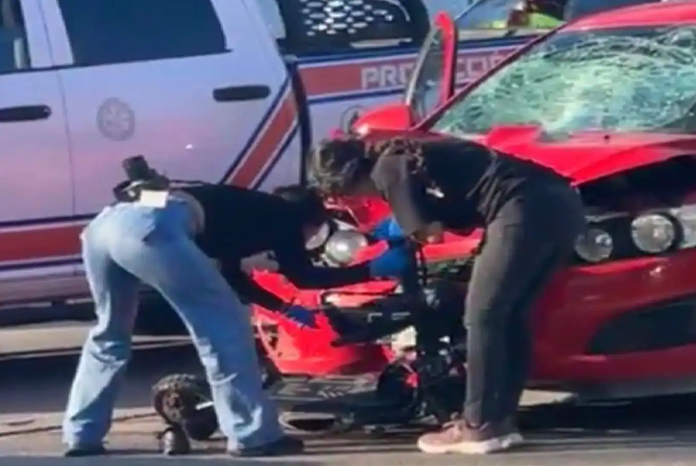 El patinete eléctrico quedó atrapado debajo de la parte delantera del coche. 8 de abril de 2026.