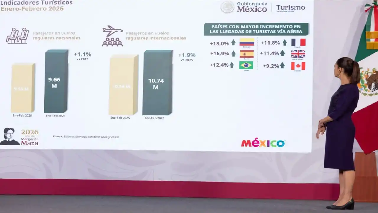 En febrero, México recibió 8.01 millones de visitantes internacionales, lo que representó 8.5 por ciento más respecto a enero de 2025, cuando arribaron 7.38 millones, agregando que Mazatlán alcanzó cifra récord de cruceros durante Semana Santa.