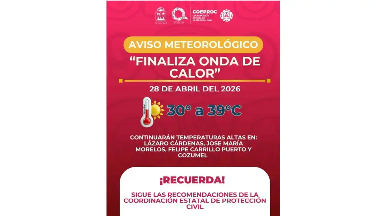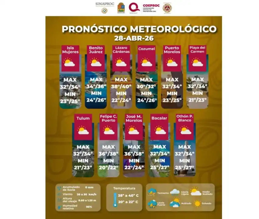 La advertencia de alta temperatura ahora se ha ampliado para incluir a Lázaro Cárdenas, José María Morelos, Felipe Carrillo Puerto y la isla de Cozumel.