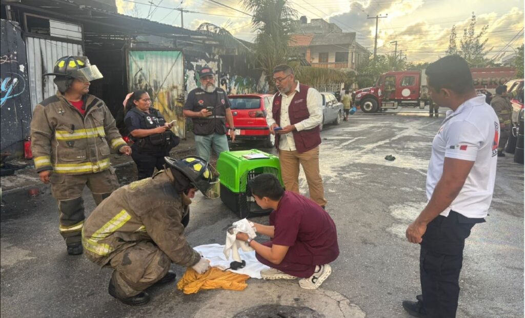 Bomberos de Cancún encuentran gatitos durante inspección de enfriamiento de incendio en taller de reparación mecánica