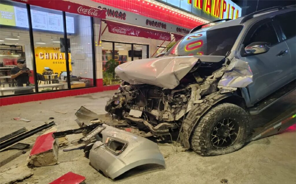 Parte delantera de una camioneta destruida al estrellarse contra un restaurante de tacos en Cancún